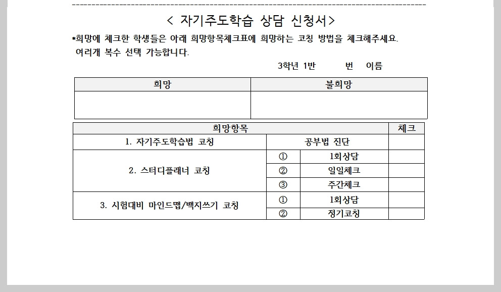 어떤 학생들은 1회 상담으로 끝나기도 하고 어떤 학생들은 일일/주간체크 혹은 정기코칭 등의 방식으로 꾸준하게 자기주도학습을 이어갈 수 있게끔 도와준다. 아무리 내가 학생들에게 도움을 주고 싶다 해도 강제로 시킬 수는 없기에 신청서를 나눠주고 신청한 학생들에 한해서 프로젝트를 진행하는데 올해도 생각보다 많은 학생들이 신청을 해주었다.