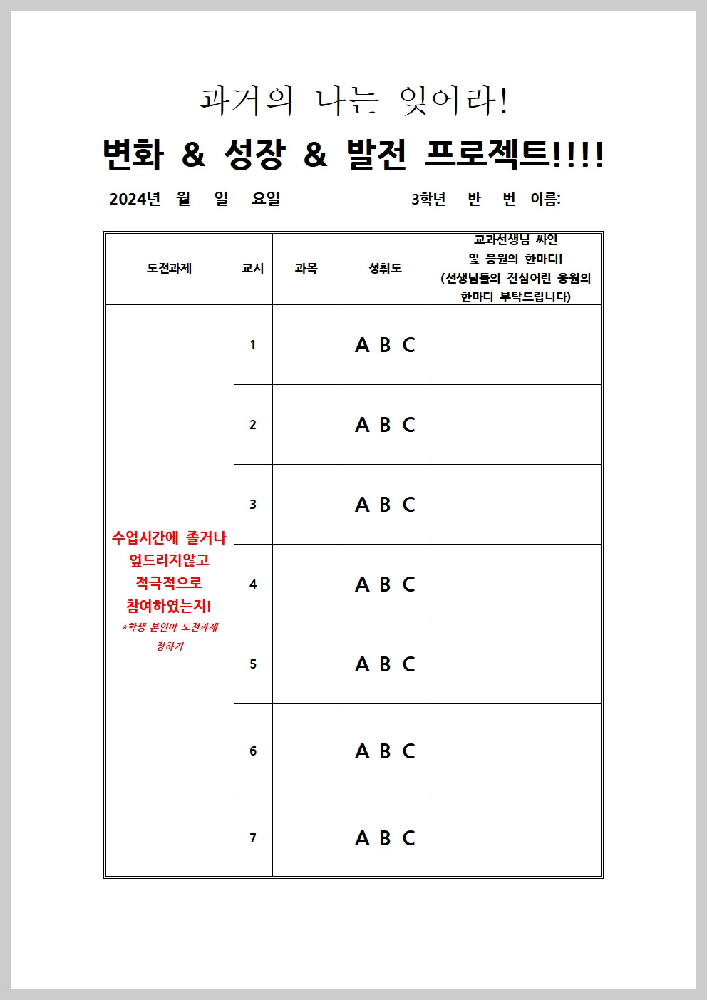 프로젝트는 다음과 같다. 이 프로젝트를 하겠다고 의지를 보인 학생은 본인의 도전과제를 적고 매 수업시간 해당 도전과제를 잘 해냈는지 교과선생님께 성취도와 응원한마디를 받아오면 된다. 담임인 나는 미리 우리 반에 들어오시는 모든 교과선생님들께 메시지를 드리며 부탁을 드렸다. 우리 반의 모 학생에게 이런 미션을 주었는데 교과시간에 관심 어린 시선으로 잘 지켜봐 주시고 조금이라도 이전과 나아진 모습들이 보인다면 칭찬과 격려의 한마디를 적어주십사 말이다.