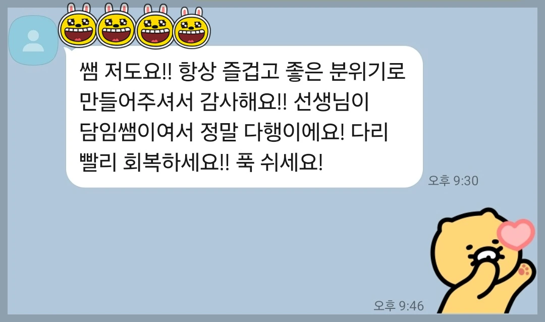 학급 학생들은 하나같이 담임인 나를 걱정해 주고, 복도에 담임선생님이 보이기만 하면 저 멀리서도 한달음에 달려와 나를 부축해 주었다.