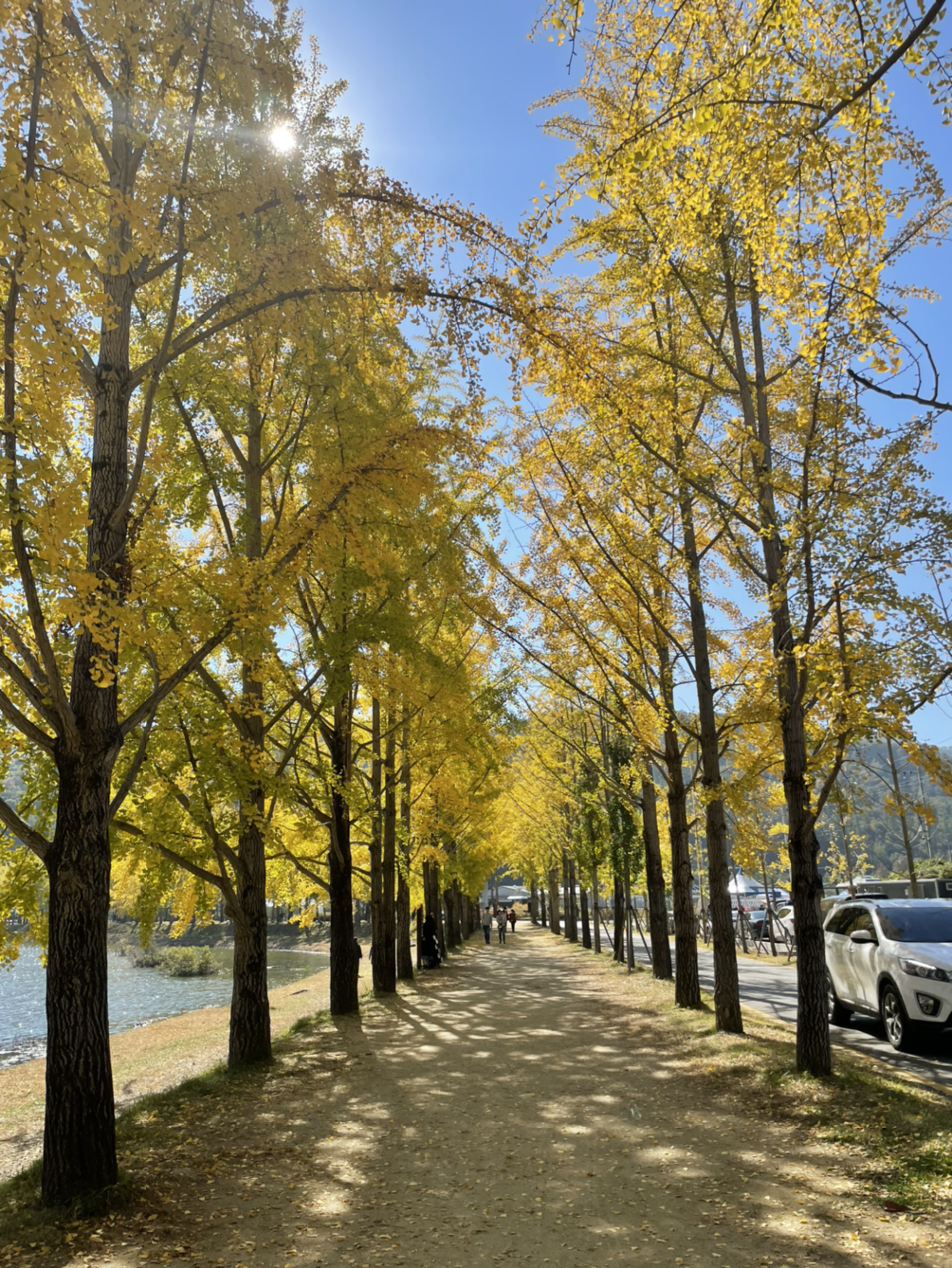 아침은 느지막하게 일어나 리조트를 정리하고 조식을 먹으러 내려갔습니다. 조식으로 나온 해장국을 다들 말도 없이 맛있게 먹고, 근처에 있는 저수지로 달려갔습니다. 지금사진 작가님께서 알고 있던 저수지라 저는 저수지 이름이 기억이 나지 않습니다. 이 몹쓸 기억력. 그래서 꼭 적어두는데 이 날은 숙취와 더불어 밀린 피로가 밀려와 졸기 바빴습니다.ㅎㅎㅎ 아침에 갔던 저수지에는 노오란 단풍이 예쁘게 길을 만들어 저희들을 기다리고 있었습니다.