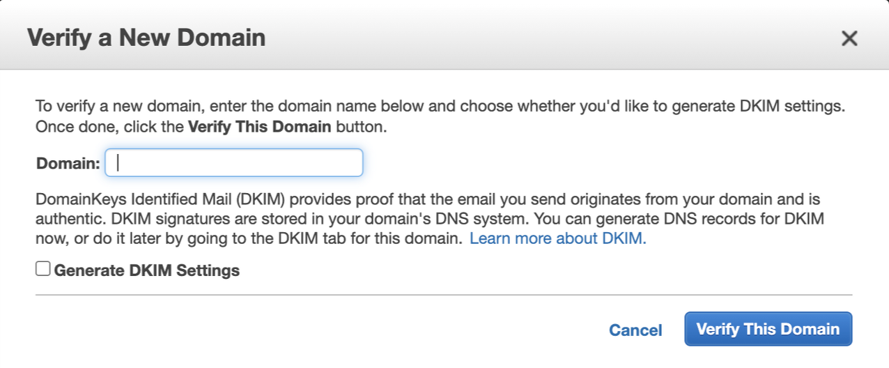 Verify a New Domain을 클릭하면 이런 창이 뜨는데 여기 Domain에 자신이 구입한 도메인을 입력해주면 된다. 아래 Generate DKIM Settings는 체크를 해도, 안 해도 다음 단계로 넘어갈 수 있다. 체크를 하게 되면 좀 더 보안이 강화되는 것 같은데, 한국어로 읽어봐도 어떻게 작동한다는 것인지 잘 모르겠다.