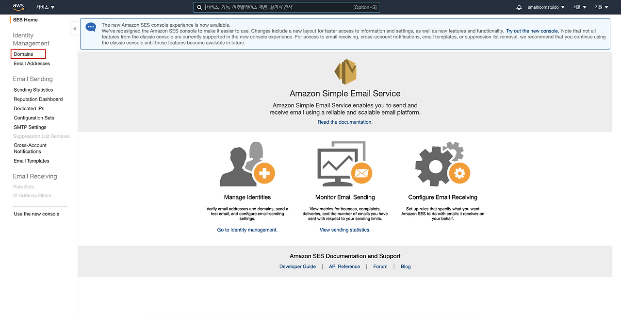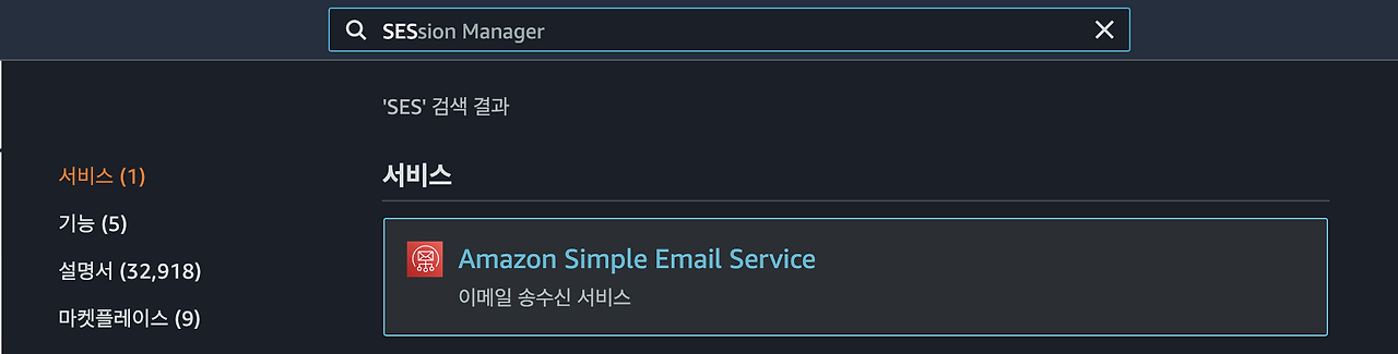 AWS를 사용하신다면, 도메인 구입, 관리 등등을 Route 53에서 할 수 있다. Route 53에서 메일을 연결하기 위해서는 로그인 후, 검색창에 SES라고 검색한다. (SES는 Simple Email Service의 약자)