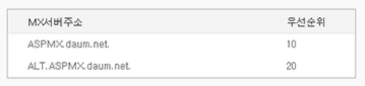값을 입력할 때 형식이 [Priority] [mail server host name] 순서이므로 10 ASPMX.daum.net. 20 ALT.ASPMX.daum.net.으로 입력해야 하고, 서로 다른 줄에 입력해야 함.