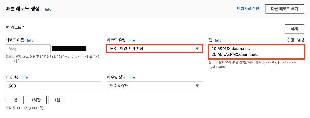 레코드 이름은 원하는 대로 작성하면 되고 (mail 등) 라우팅 정책과 TTL은 기본값이 단순 라우팅, 300이므로 그렇게 두면 된다. 레코드 유형과 값만 잘 입력하면 이제 끝! 레코드 유형은 'MX'로 하고 해당 값에 들어갈 내용은 다음 스마트워크에서 아래처럼 알려준다.