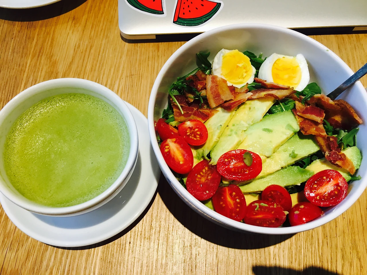 -> 집 앞 카페, Pavement는 녹차 시럽을 쓰기 때문에 그린티라떼가 단 편이지만 따뜻하게 마시면 추운 날 아주 맛있다. 같이 보이는 샐러드도 굉장히 맛있었다.