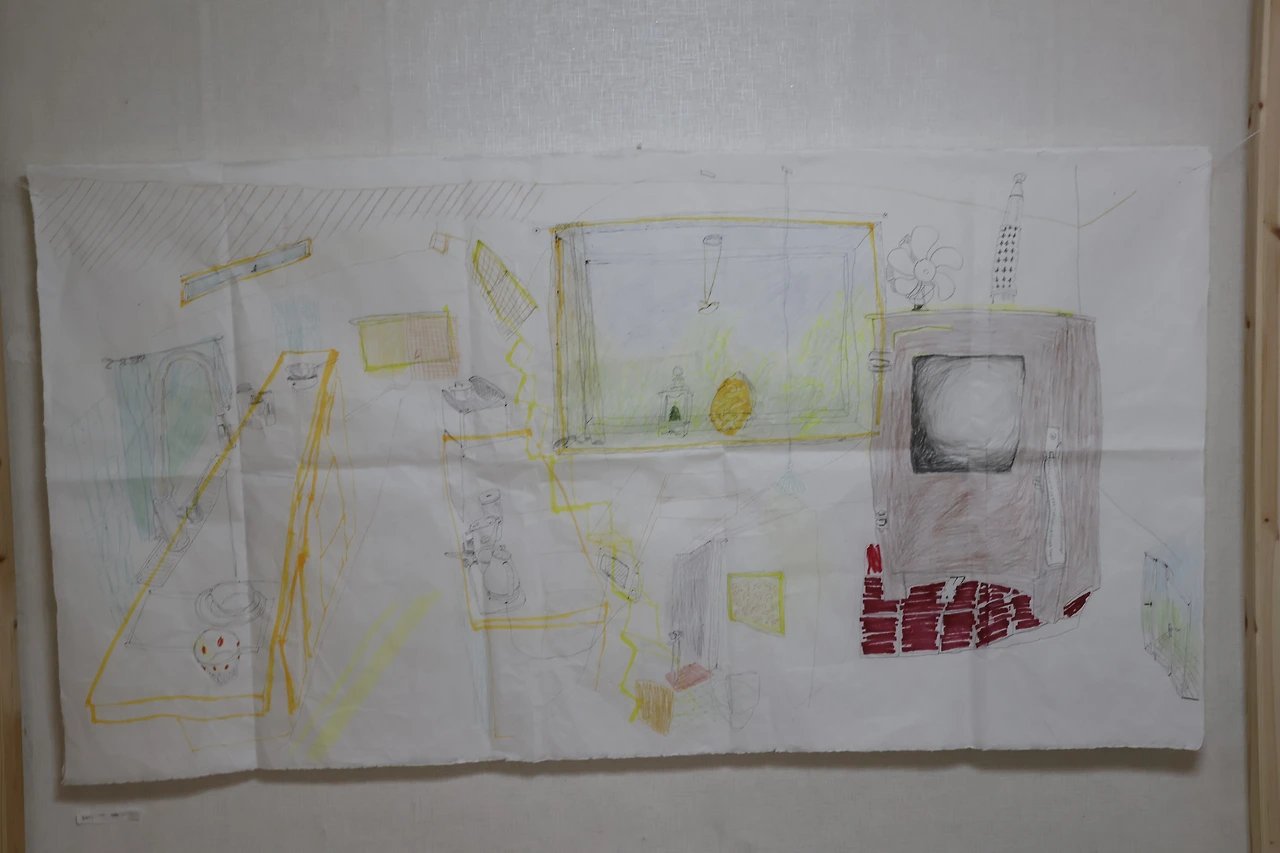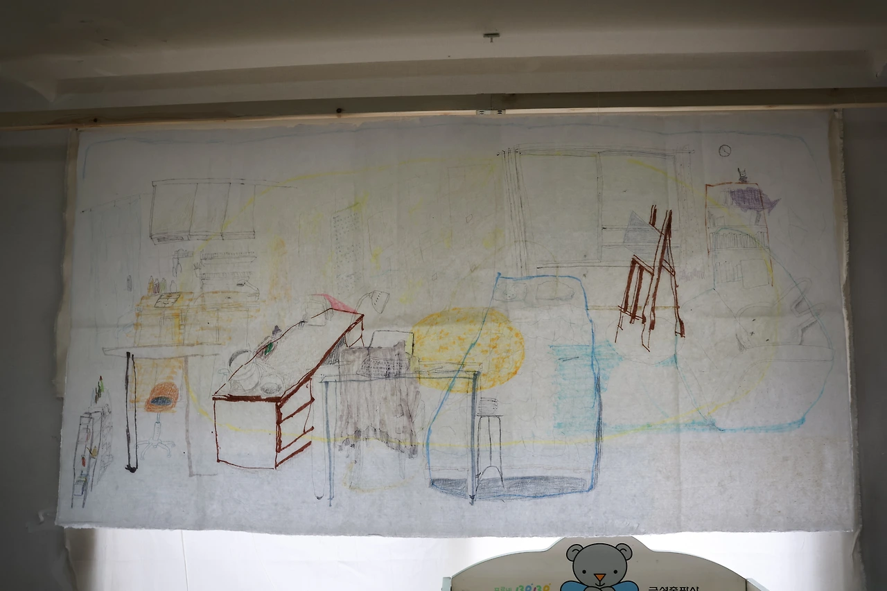 천장이 낮은 집도 있었다. 작가는 몸을 숙여 들어가야 하는 그 좁은 공간을 낮은 시선에서 바라보았다. 볼펜으로 눌러 그린 천장의 선들은 조금씩 기울어 있고, 빛이 닿지 않는 모서리에는 짙은 회색이 쌓여 있다. 그러나 어둠 속에서도 침실의 온기는 놓치지 않았다. 그 빛을 색연필로 은은하게 채색해, “빛은 항상 어딘가엔가 존재한다”라는 사실을 말없이 전한다.