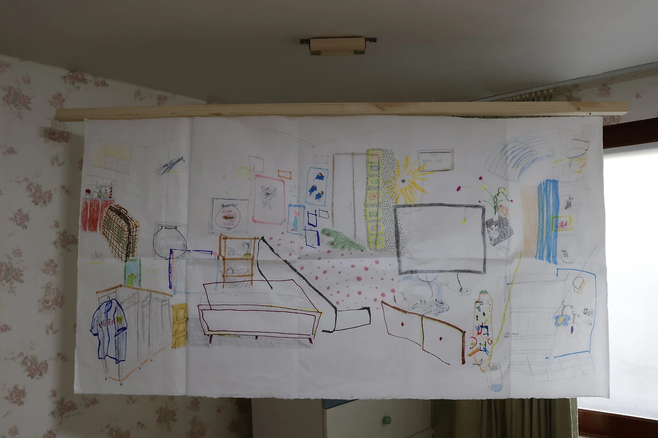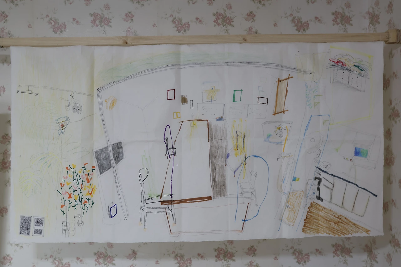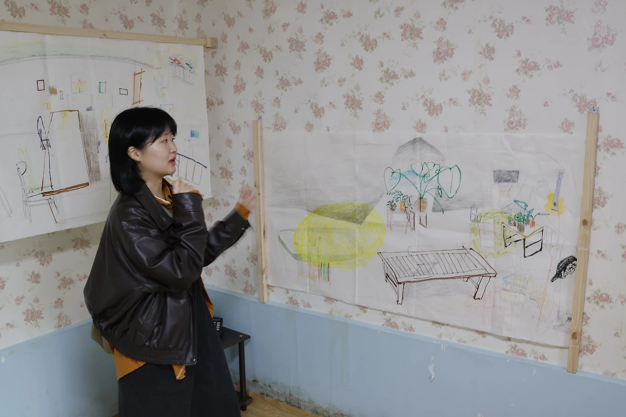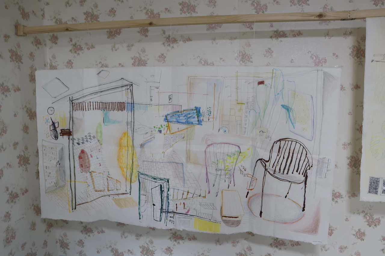 다음으로 만난 집은 아이들이 사는 집이었다. 집 한구석에 그려진 꽃 모양의 낙서가 작가의 눈길을 사로잡았다. 아이들의 손길이 남은 귀여운 흔적은 고스란히 그림으로 옮겨졌다. 민예원은 그 흔적들을 지우거나 교정하지 않았다. 오히려 색연필과 마카로 그 위를 덧그리며, 아이들의 시간과 함께 집이 자라나는 모습을 표현했다. 그 그림 앞에 서면, ‘집’이란 어른이 만들어놓은 구조물이 아니라 ‘함께 살아가는 존재들의 흔적’임을 깨닫게 된다.