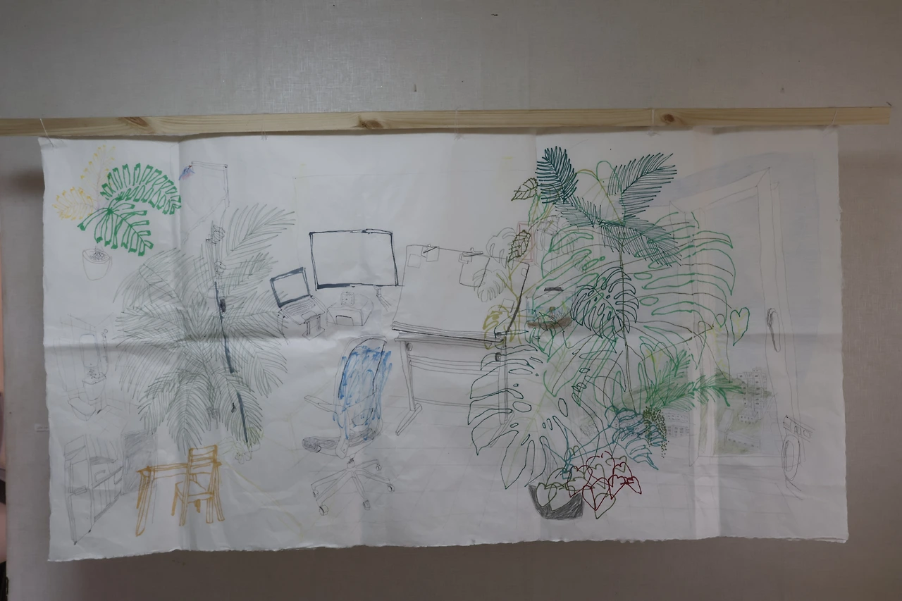 식물이 가득한 집은 초록색이 싱그러운 그림이었다. 마카와 색연필이 겹친 초록의 층이 화면을 덮고, 크고 작은 화분의 식물들이 서로의 잎을 감싸고 있다. 작가는 그 집을 “식물과 사람이 공존하는 공간”이라고 했다. 실제로 작품 앞에 서면 그 초록의 공기가 그대로 전해진다.