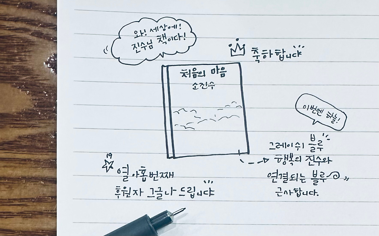 세 번째 후원자는 김은명 대표님이었다. 지난 1년 동안 문헌정보학 수업을 함께 들으며 내 글을 가장 가까운 자리에서 지켜봐 준 분이다. 대표님께 받은 두 자루의 펜. ‘계속 쓰는 사람으로 남아 달라.’라는 신뢰의 형태였다. 어떤 격려는 말보다 조용히 오래 남는다. 대표님이 늘 해오던 방식이 그렇다. 언제나 내 글을 기다리는 사람. 그런 독자가 있다는 사실만으로도 책 한 권을 세상에 건네볼 만한 용기를 얻는다. 살다 보면, 나보다 나를 더 믿어주는 사람을 만나기도 한다. 대표님은 내게 그런 존재였다. 책에 자신의 이름이 들어가지는 않지만, 자기 일처럼 기뻐하는 사람이 있다는 것. 그건 글 쓰는 사람에게 주어지는 가장 큰 선물이다.