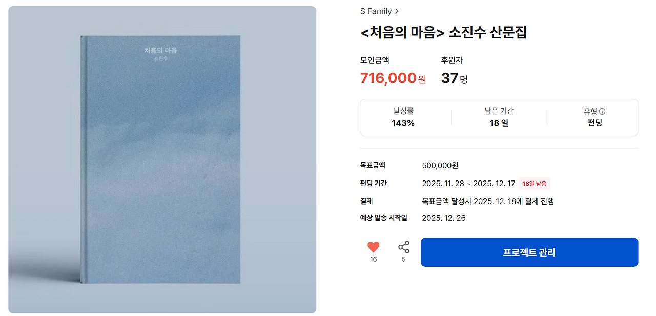생각해 보면 이번 펀딩은 나 혼자 여는 문이 아니었다. 책 한 권이 저자의 이름으로 세상에 나오기까지, 책 뒤에는 이름 없이 함께 손을 보태준 사람들의 마음이 겹겹이 얹혀 있다. 펀딩 첫날, 37분이 내 책을 믿어줬다. 숫자보다 중요한 건 정성이었다. 그 숫자만큼의 마음이 화면 너머에서 나를 지켜봐 주고 있었다. 그 마음들이 모여 716,000원이라는 숫자가 되었을 뿐이다.