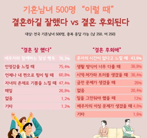 결혼의 장점과 단점을 종합해 보면 결혼은 서로에게 기대어 느끼는 안정감과 둘 사이에서 만들어지는 행복감과 동시에 개인적인 시간이 부족하거나 금전적인 문제 혹은 제삼자로 인해 발생하는 문제들도 동시에 가지고 있다. 눈에 보이지 않는 행복감과 피부로 느껴지는 부족한 것들 사이에서 결혼에 대해 고민하고 주저하게 되는 것이다.
