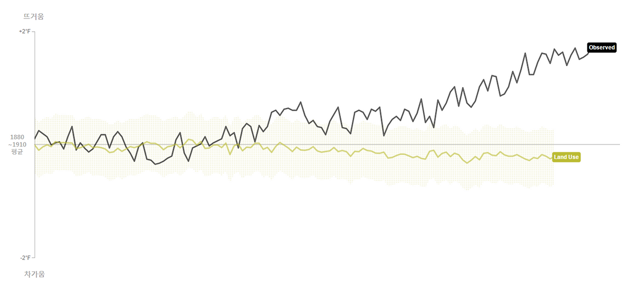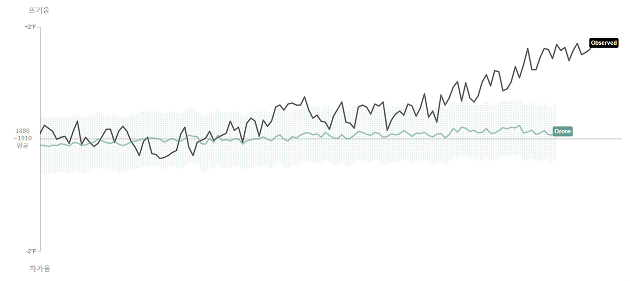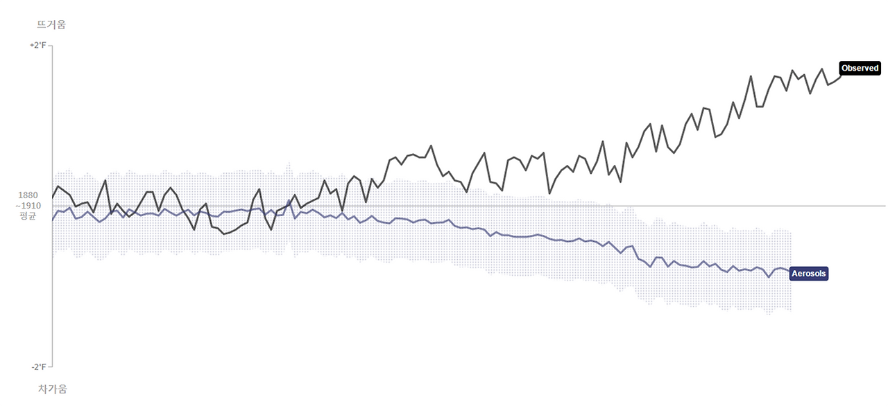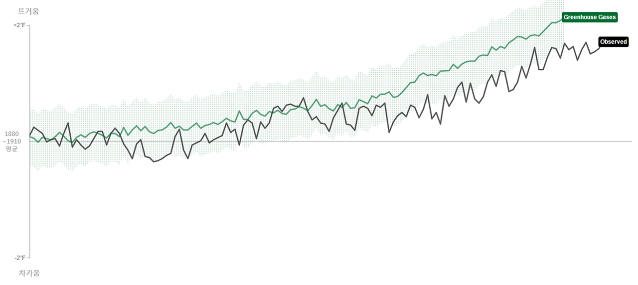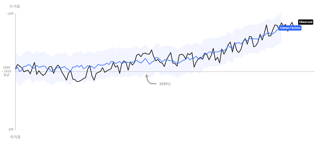 위에서 언급한 산림 벌채, 오존 오염, 미세먼지, 온실가스 등 지구에 영향을 미친 인간의 주요한 활동들의 영향을 모두 합해보면, 1950년 이후로는 실제 지구온도 상승과 약 90% 싱크로율에 근접한 결과를 얻을 수 있었다. 그 말은 인간 활동이 지구 온도 상승에 미치는 영향이 90% 이상이라는 것이고, 특히 온실가스 배출의 영향이 가장 높았다.