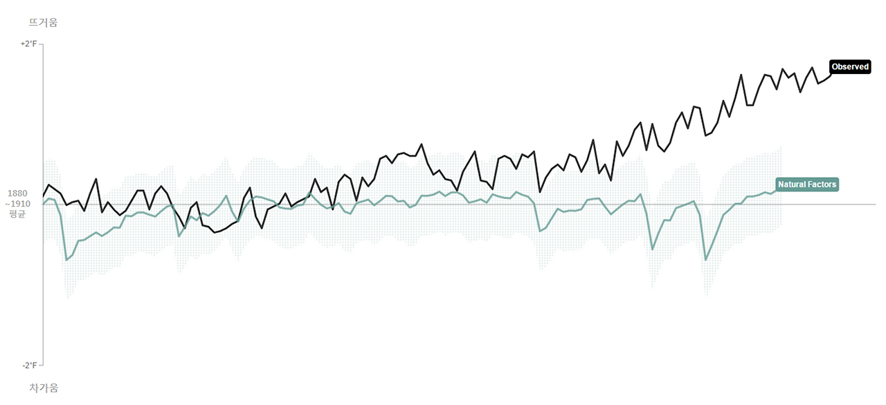 아래 그래프에서 확인이 되지만, 1950년 이후 지구 온도 변화와 자연/인간 요소를 모두 합한 결과는 놀랍게도 약 98%의 싱크로율을 보였다. 이로써 인간 활동, 특히 온실가스가 지구온난화의 주범이라는 사실을 밝혀냈다. 자연현상이 미치는 영향은 미미할 뿐, 기후변화 회의론자들이 내세운 근거는 모두 과학적인 사실(fact)이 아니라는 사실이다.