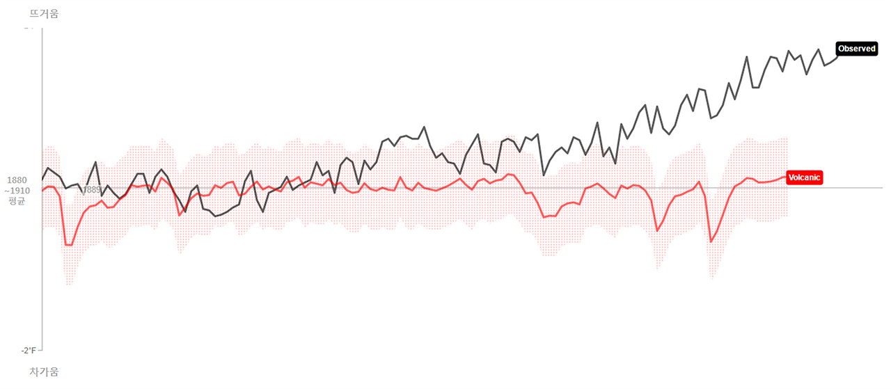 아래 NASA의 데이터에서 보듯이, 화산 활동의 영향은 미미했습니다. 1880년 산업혁명 이후, 산업화로 인해 배출된 이산화탄소(CO2)양이 화산 활동을 통해 배출된 양의 100배에 달한다. 또한 화산 폭발을 통해 나오는 화산재 등은 실제로 지구 온도를 1~2년간 하락시키는 주요한 원인이다.