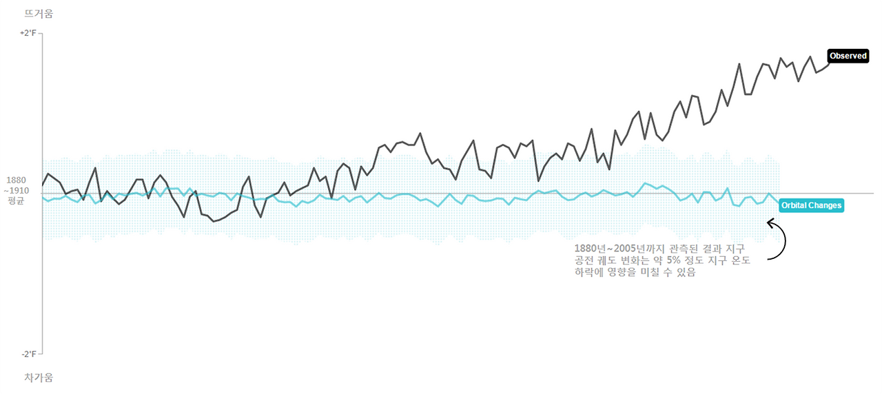 지구의 자전축과 태양을 중심으로 한 공전 궤도는 수 천에 걸쳐서 조금씩 변경된다. 실제로 공전 궤도의 변화가 지구의 빙하기와 간빙기를 만든다는 것이 현대 과학에서 가장 설득력 있게 주장되는 원인인데, 아래 그래프에서도 볼 수 있듯이, 지난 125년간 지구의 궤도 변화는 지구 온도 변화에 아주 미미한 영향을 미칠 수 있었다.