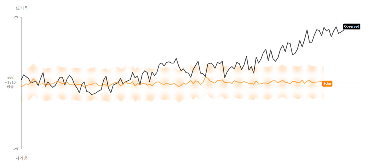 태양의 온도는 수십 년에 걸쳐서 변화하는 것이 정상이다. 하지만, 태양의 온도가 미치는 영향은 아래 그래프와 같이 지구 온도에 거의 영향을 미치지 못했다.