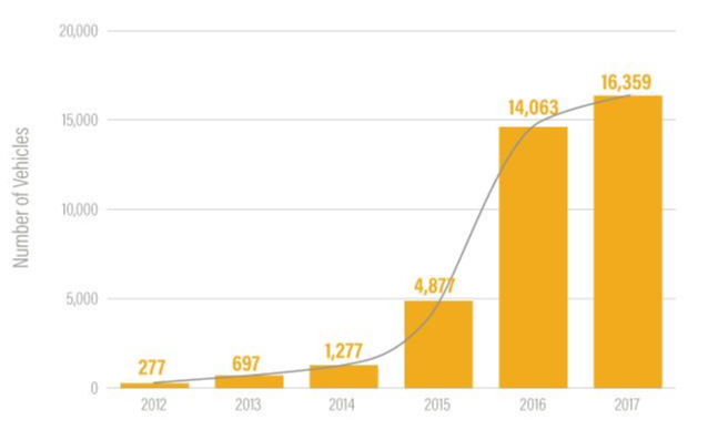 현재 중국 내 운전중인 버스의 17%가 전기버스이고, 매 5주마다 영국에 있는 전체 버스 숫자만큼 전기버스가 늘어나고 있고, 이는 전세계 전기버스 증가량의 99%를 차지하고 있다고 합니다. 특히 '선전(Shenzhen)'이라는 신도시에서는 2017년도에 도시 전체 버스 16,359대<표4>를 모두 전기버스로 교체하는데 성공했다고 합니다. 단순히 그 양 뿐만 아니라, 증가 속도가 정말 어마어마한데요. 이러한 변화는 정부의 전기버스 보조금이 있었기 때문에 시작이 가능했지만, 더 장기적으로보면 전기 버스를 유지하는 비용이 경유차의 유지비용(환경비용 등 포함)보다 훨씬 저렴하고, 국민들의 건강과 환경을 개선하기에 비교할 수 없을 정도로 긍정적인 편익이 있습니다.