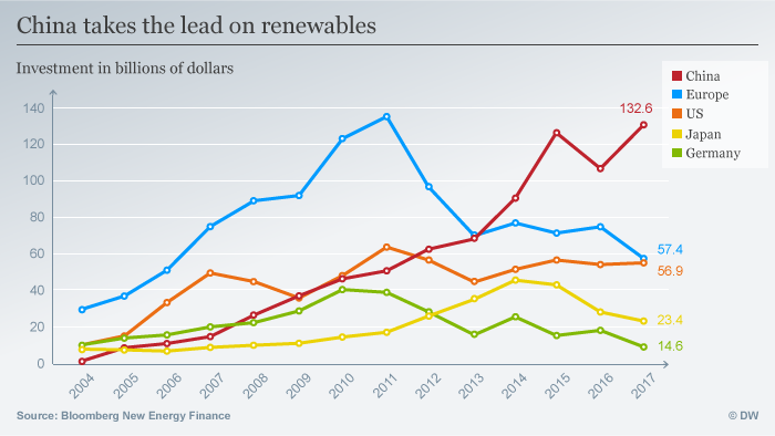 재생가능에너지의 확대는 화석연료를 대체하여 환경선진국이 되는 가장 효과적인 방법기도 하지만 동시에 경제 발전에 아주 좋은 투자 기회이기도 합니다. 2017년 한해 에만 중국에선 약 1,326억 USD(약 140조원)을 재생에너지에 신규 투자하였고, 이는 전세계 재생에너지 투자금액의 45%에 달합니다. 특히 태양광의 경우 2016년부터 2017년까지 매일 축구장 24개 규모의 태양광 발전소가 지어져 현재 중국 내 태양광 발전량이 단 1년만에 약 2배로 늘어났습니다. 그리고 가장 좋은 투자 효과 중 하나는 중국 자체 기술로 중국 내부의 프로젝트에 투자되어 수백만개의 양질의 일자리와 세계적인 기술 수준의 에너지 신산업을 육성하는 효과가 있었다는 점 입니다.