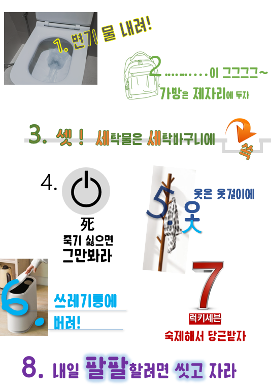 가방 제자리, 쓰레기는 쓰레기통에, 불 꺼, 문 닫아...