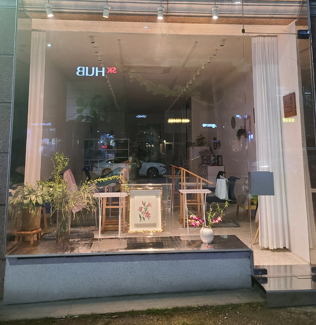 나지막한 길가 건물 1층 쇼윈도에, 자수 작품을 꽃과 함께 디스플레이하고