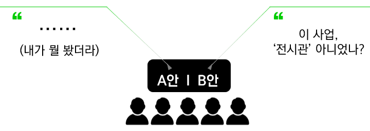 제안요청서(RFP,Request For Proposal)를 보자. 사업목적을 ‘보존을 위한 전시공간’과 ‘가치 확산의 홍보공간’이라고 분명하게 제시했다. 그러나 B안은 ‘창의적이고, 예술적 가치가 높은 전시설계’라는 문구에 집중하여, 기획을 홍보 공간으로만 한정되었다. 전시 디스플레이를 버리고 홍보를 위한 첨단영상으로 모든 공간을 채운 것은 모험이었다.