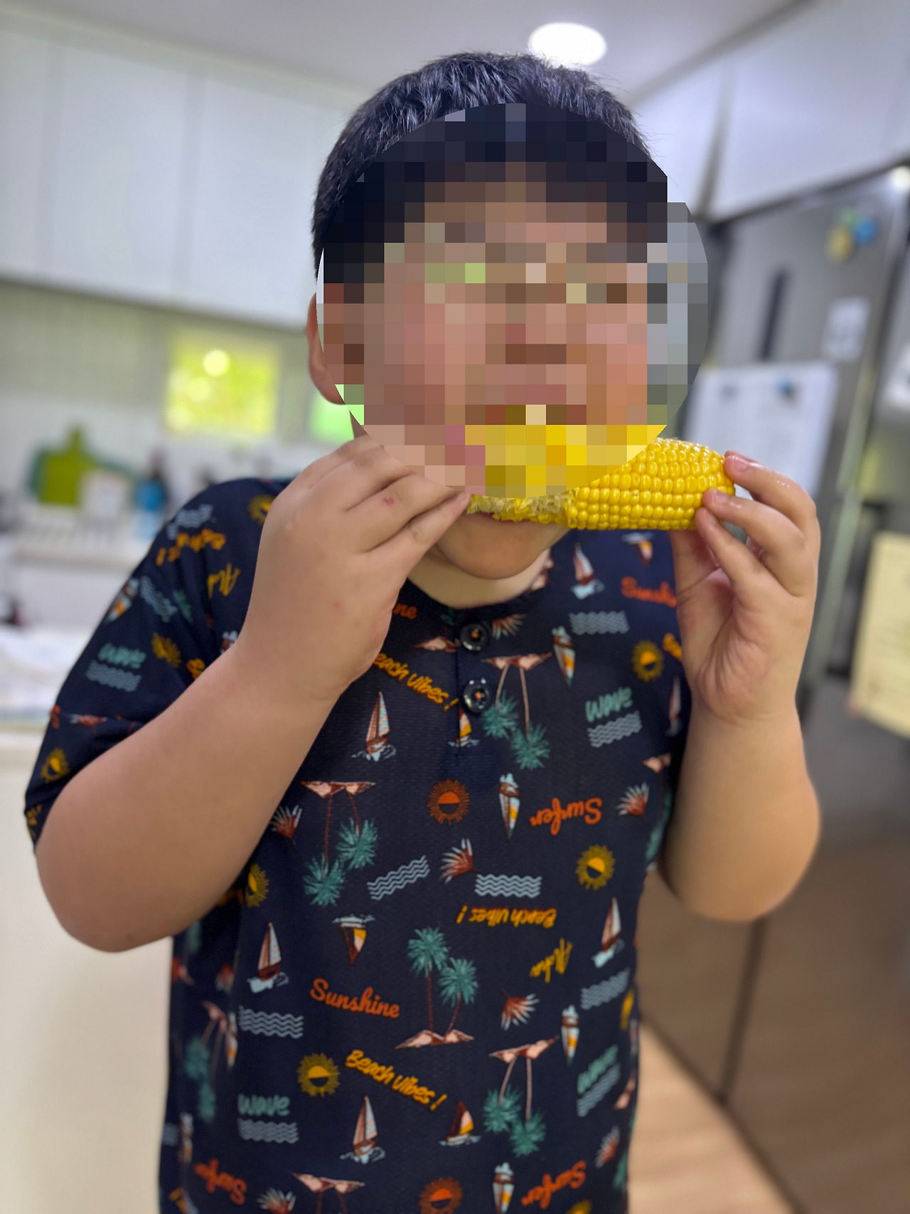 "그렇지? 지금만 반짝 먹을 수 있는 거야." 기회 놓치지 말라는 말이다. 처음에 맛있다며 옥수수 한 개를 쥐고 먹더니 더 이상 안 먹는단다. 오예~! 다 내 거.