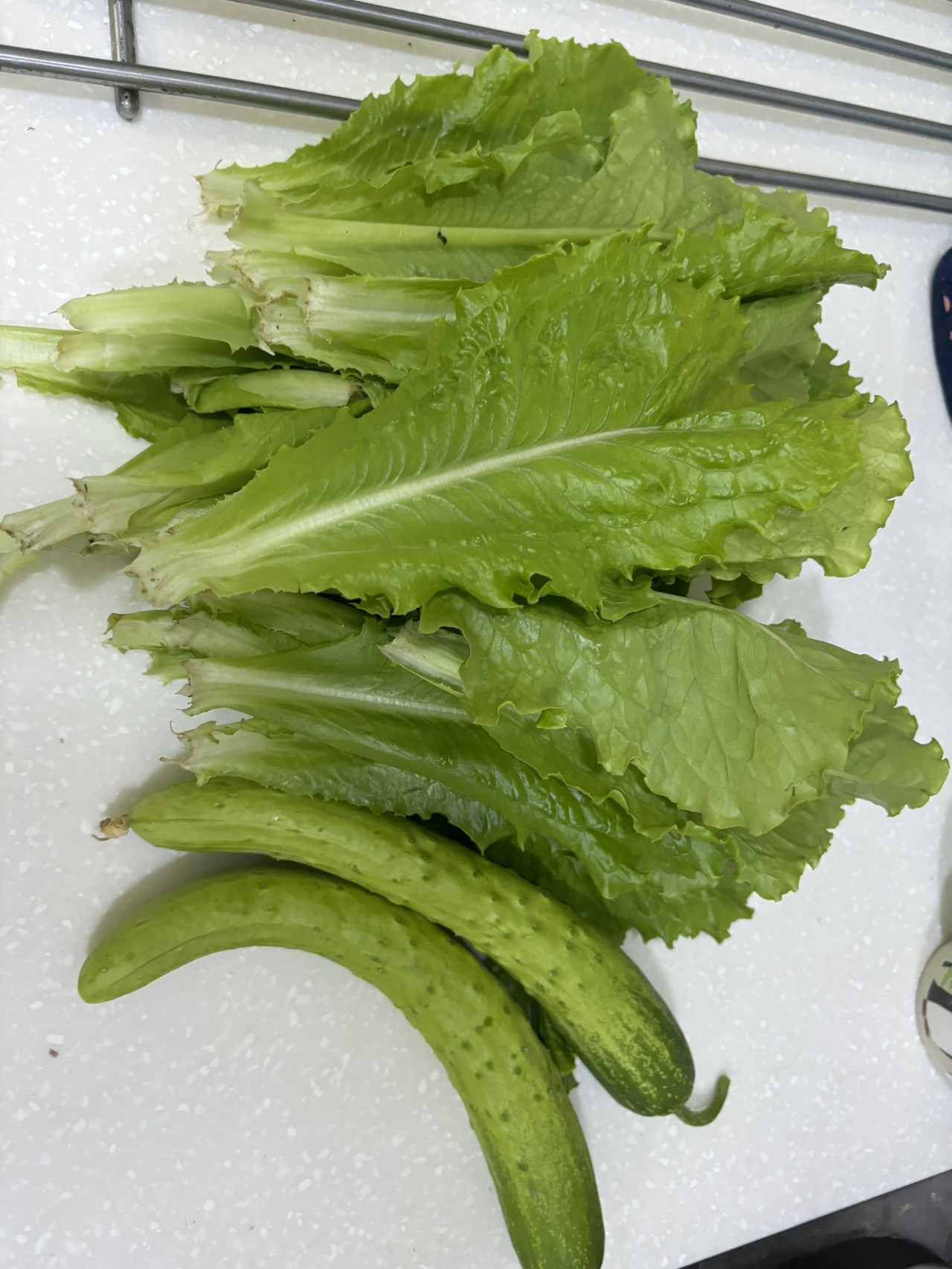 "맛있지? 방금 윗집 할머니께서 귀한 상추랑 오이랑 조금 전에 주셨어. 방금 밭에서 따오신 거래."