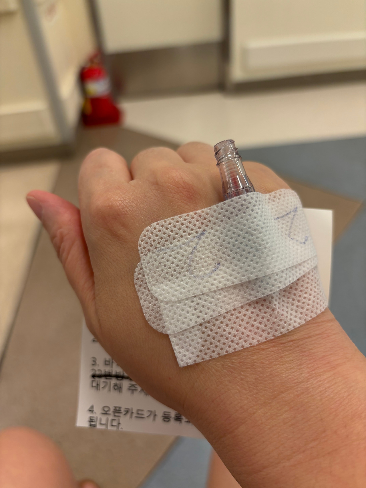 병원 로비에서 물을 마시며 관찰을 하니 다행히 검사 직 후에 느껴졌던 목도리로 동여맨 듯 답답했던 목이 좀 풀렸다. 손등의 부풀었던 채혈 자국이 평평해졌다. 살았다!