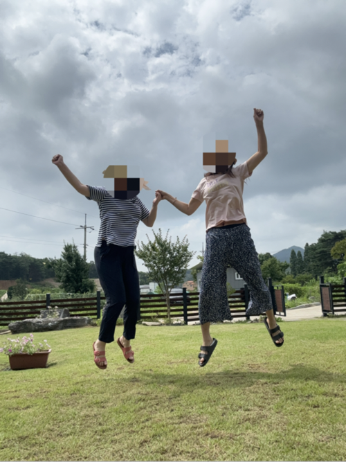 철없이 농담하고 만나면 해드뱅잉이 일상이었던 우리가 결혼을 하고 아이를 낳고 다시 만났다. 내 눈에는 아직도 그녀는 처음 만났을 때 여고시절 얼굴로 보인다. 우리 부모님께서도 너는 어쩜 그대로냐고 반기셨다. 남편들이 아이를 봐줘서 우리끼리 볼 수 있어 이 시간이 더욱 귀하게 느껴졌다. 엄마가 주신 몸빼 바지를 나눠 입고 텃밭에서 상추를 뜯고 고추를 따서 고기를 구워 밥을 먹었다. 이미 지난 나의 생일이지만 케이크 또 하자며 케이크까지 사 와서 초등학생처럼 친정집에서 파티도 했다. 핸드폰으로 정말 더럽게 안 맞는 점프샷을 찍고 관절 아프다며 낮잠도 퍼져 잤다. 니 방귀가 더 독하다 아니다 네가 더 독하다며 선풍기 앞에서 방귀 뀌지 말라고 투닥 대며 자는 게 아쉬워 밤늦도록 수다 떨다 새벽녘에나 잠이 들었다. 동네 친구가 친정 가서 부럽다며 뭐 하냐고 하길래 친구랑 1박 하며 놀고 있는 사진을 보냈더니 MZ 촌캉스 같다며 너무 부러워했다. 그럼 너도 오라며 언제든 환영한다고 초대했다. 우리 엄마는 이 사실을 모르지만 아마 좋아하실 것이라 믿는다.