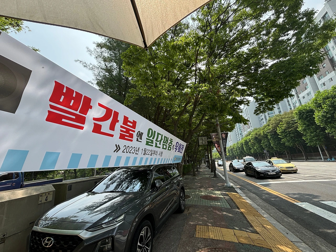 집 베란다에서도 보이는 매일같이 드나드는 길에서 누군가 교통사고 죽었다는 것이 적잖이 충격으로 와닿았다. 뉴스에서 떠드는 다중추돌 사고의 보도를 들을 때보다 몇 배의 공포로 다가왔다. 내가 잘못하지 않아도 피해를 볼 수 있다는 사실에 무기력함을 느낀다. 며칠 후에 그곳에 아주 커다란 플랜카드가 붙었다.