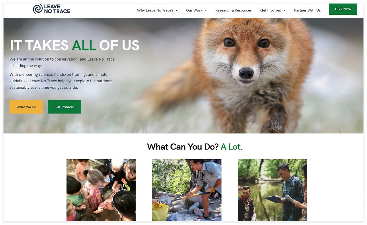 자연보호를 위해 특정 지역의 방문을 제한하거나 행동을 억제하는 방식이 아닌 활동 수칙과 기술 교육 프로그램이나 연구조사, 캠페인 등을 통해 사람들에게 아웃도어 활동 시 자연보호의 중요성을 전파해 나가고 있다.