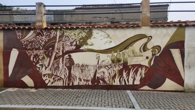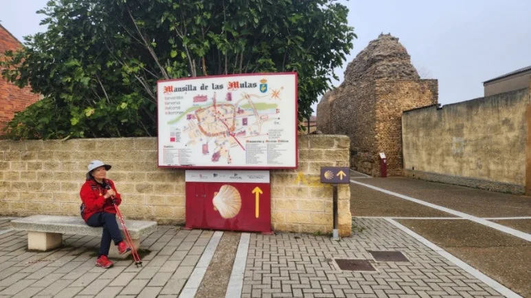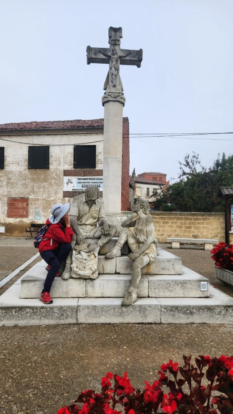 성벽이 보이고 마을로 들어가는 성문이 보였다. 성문 앞 로터리에 산티아고 순례자들의 고뇌와 수행을 나타내는 조각과 벽화를 보았다.