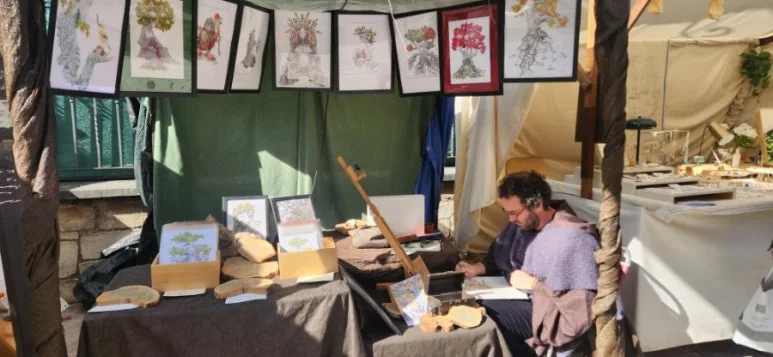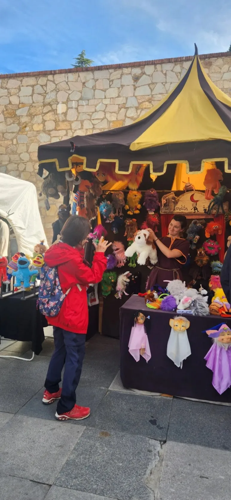 장사하는 사람들은 전통 옷을 입고 자신이 열심히 만든 물건을 팔고 사람들은 즐거워한다.