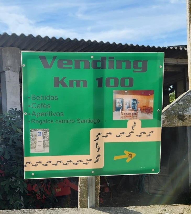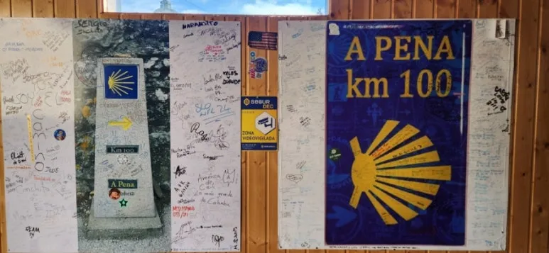 조금만 더 가면 드디어 산티아고 데 콤포스텔라까지 100km가 남았다는 표지석을 만난다. 100km를 기념하는 세요도 있다고 하니 쉬지 않고 걸음을 서둘렀다. 그런데 100km 세요 찍는 카페가 문을 닫아 사진만 찍었다.