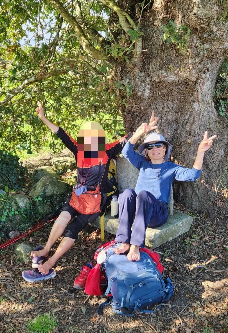 지나가는 순례자들이 발가락 운동하는 것을 보며 웃으며 응원한다.
