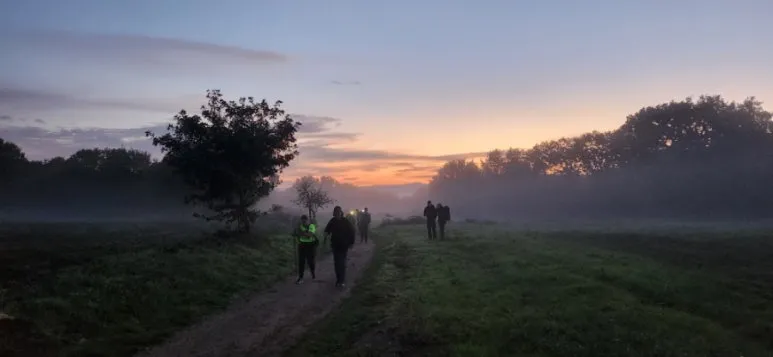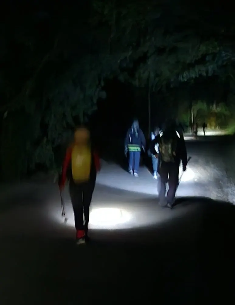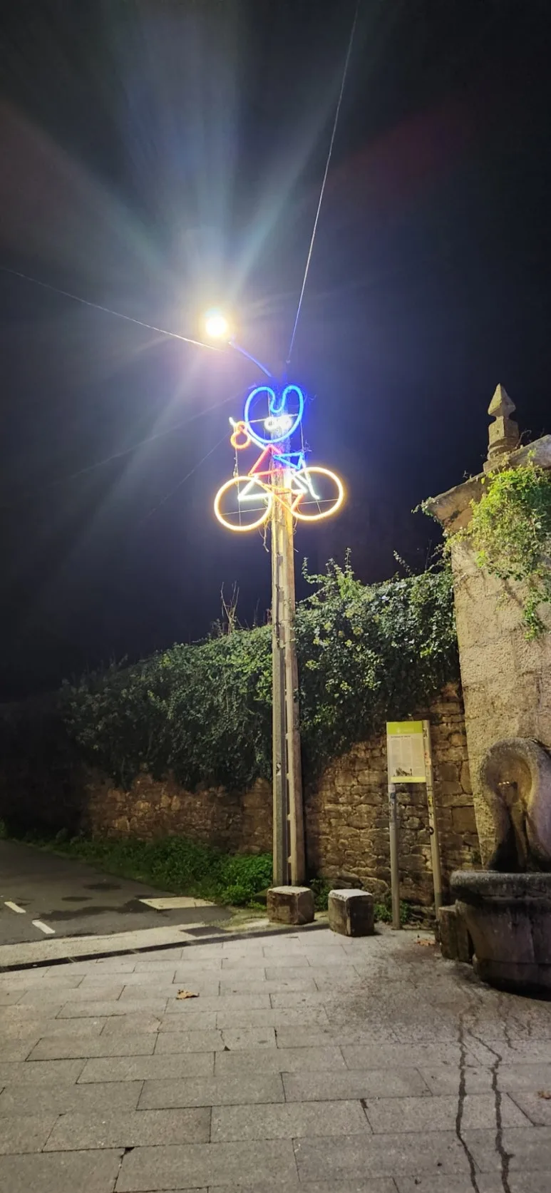 어두운 새벽 사리아를 떠나는 순례자들에게 기념사진을 찍으라며 여러 조형물에 환하게 조명을 밝혀 놓았다. 언덕을 내려가 다시 오르고 철길 옆을 걷는다.