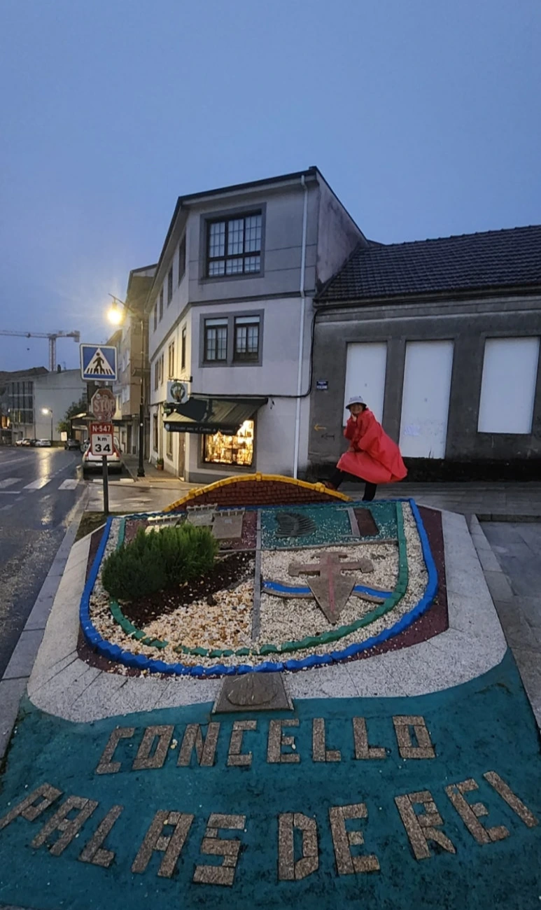 비가 오는 아침, 팔라스 데 레이의 순례자 거리의 중심지인 로터리는 먼 길을 서두르는 순례자들의 발걸음과 대화소리로 가득하다.
