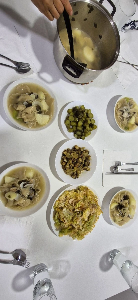 60대 후반 교수 부부께서 공용 주방에서 수제비를 만들어 먹자고 한다. 한국에서 여러 음식 양념을 준비해 오셨기에 가능한 일이다. 순례자 정식을 사 먹으려던 우리는 완전 운 좋은 날이다. 네 명이 먹을 밀가루와 감자, 조개, 양파, 배추를 사는데 8유로 밖에 들지 않았다.