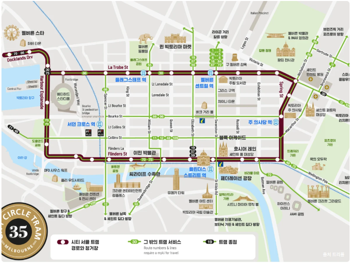 트램 35번은 공용이라 시내 중심가를 시계 서클을 돌듯 순환하며 멜버른의 주요 명소를 무료로 운행한다. 마치 서울 지하철 2호선처럼.