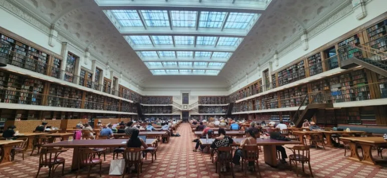 중후한 현관문을 밀고 들어서는 순간, 세상이 바뀌었다. 웅장한 로비가 한눈에 들어오고, 겹겹의 시간을 통과해 온 듯한 기둥과 천장이 나를 압도했다. 그 중앙에는 영화 속 한 장면처럼 고요하면서도 생기 넘치는 풍경이 펼쳐져 있었다. 빛이 유리 천장을 통해 쏟아지고, 그 빛 아랫사람들은 각자의 자리에서 책과 씨름하고 있었다. 낮은 웅성거림조차 지식의 숨결처럼 느껴졌다.