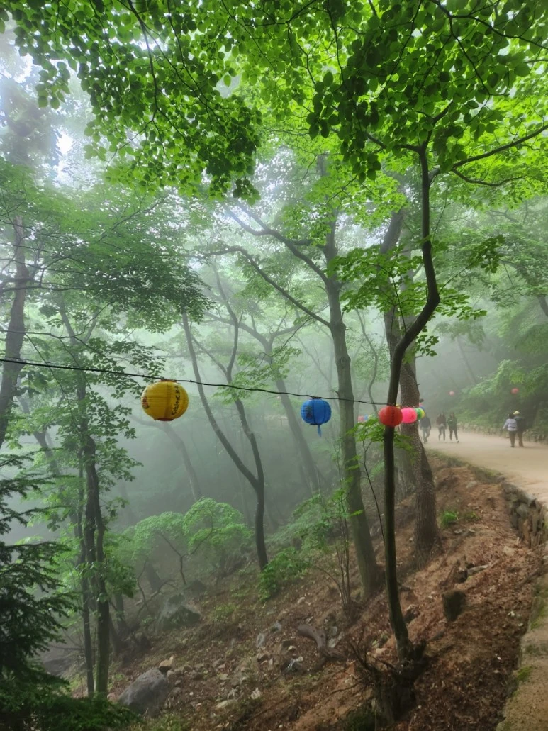 도로 옆으로 낭떠러지가 아찔했지만 알록달록 연등들이 길을 안내한다. 안개 때문에 탁 트인 동해바다가 안 보여 아쉬웠지만 오랜만에 희뿌연한 숲길을 걷는 것도 색달랐다.