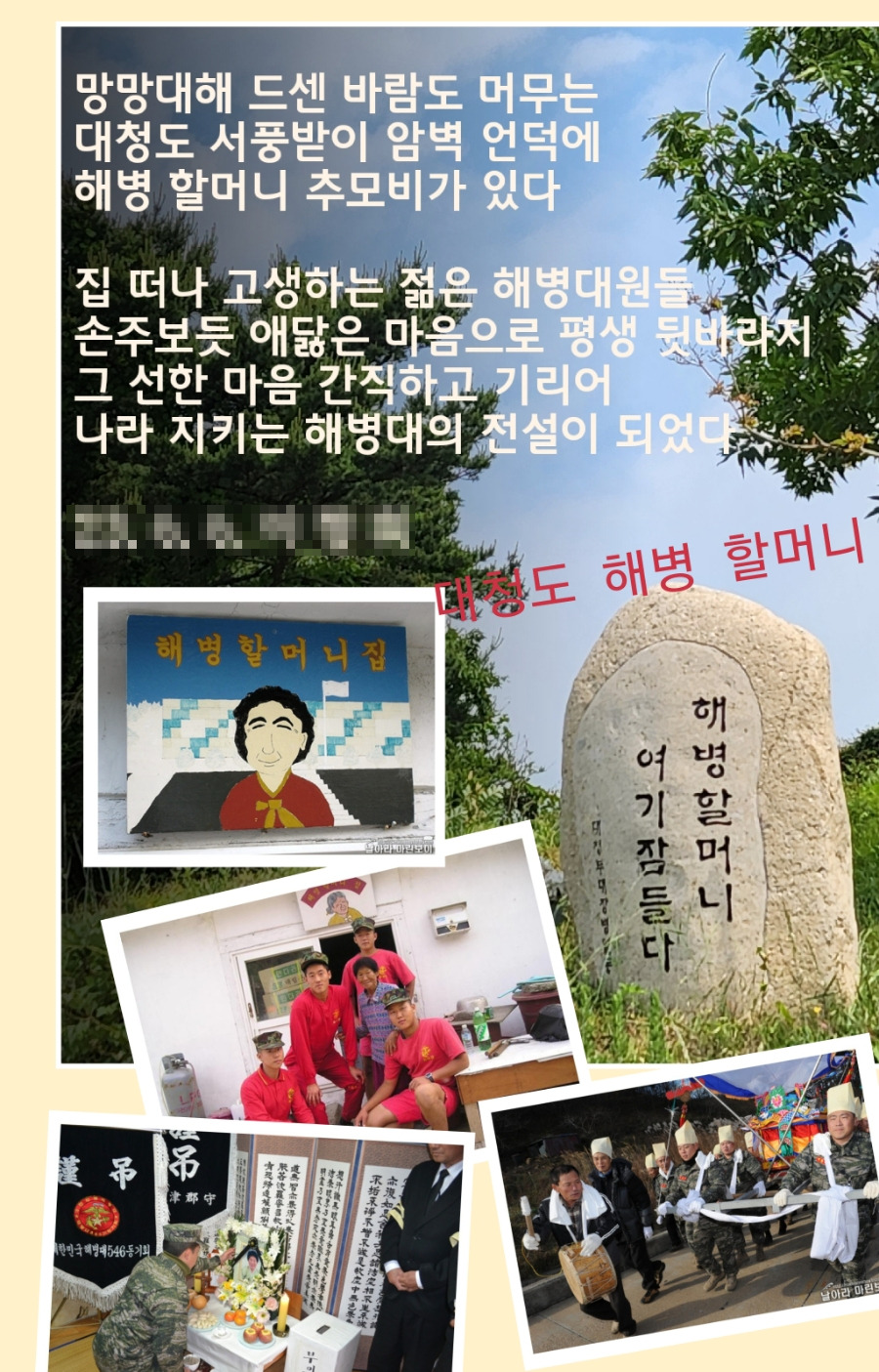 서풍받이 둘레길 입구에 쌀 모양의 ‘해병 할머니 여기 잠들다’라는 비문을 보았다. '이선비' 할머니는 낮에는 고물장수, 밤에는 삯바느질로 생활하였는데 어느 해병의 군복을 수선하면서 해병대 장병들과 인연이 시작되었다고 한다.