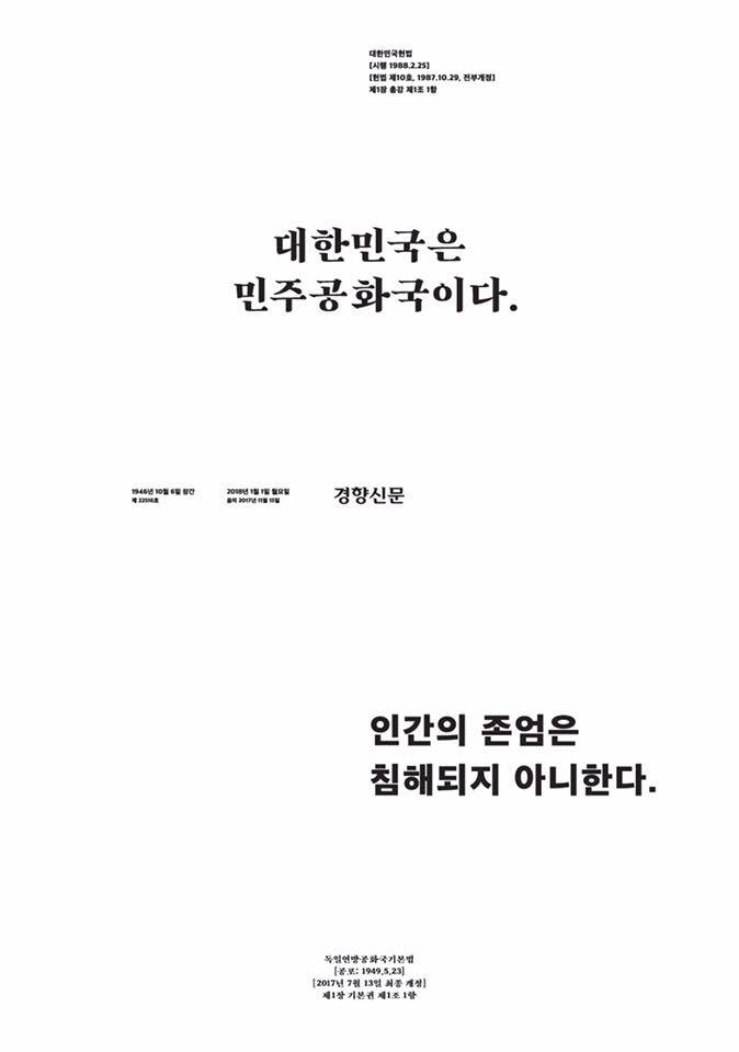 경향신문은 헌법의 '주어'에 주목했다. '대한민국'으로 시작하는 한국의 헌법과 '인간'으로 시작하는 독일의 헌법이 대비된다. 누가 옳다는 것이 아니다. 중요한 것은 다르다는 점이다. 그 다름의 간극을 우리는 어떻게 받아드려야 할까. 바꿔야 하는가, 놔두어야 하는가. 2018년 국민에게 던져진 숙제다. 숙제를 돕기위해 2면에는 주요 국가들의 헌법 1조1항을 나열했다. 이 조항들을 읽다보면 각 나라가 어떤 의지에서 시작되었는지 다소나마 가늠된다.