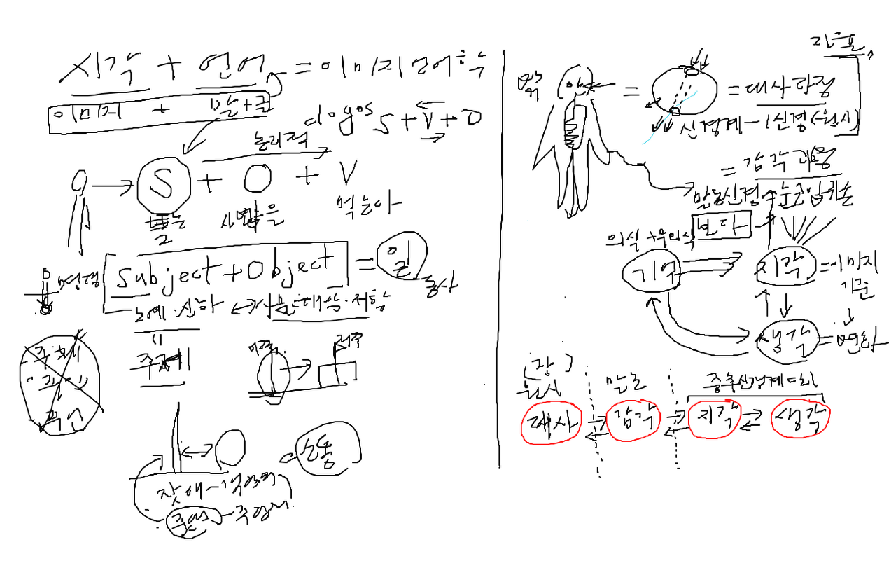 대사 과정은 자율신경계에서 이루어집니다. 고장나지 않는 이상 전혀 의식하지 않죠. 그나마 우리가 의식적으로 느낄 수 있는 것은 감각과 지각입니다. 그리고 이 감각과 지각 그리고 생각이 시각언어에 있어 아주 중요한 판단 근거가 될 수 있습니다. 지금 여러분이 읽고 있는 매체는 문자입니다. 문자언어는 시간적 맥락으로 소통되고 이해되는 매체입니다. 음악처럼요. 반면 이미지는 공간적 맥락으로 소통되고 이해되는 매체입니다. 시간적 맥락은 의식을 작동시킵니다. 그래서 문자와 음악매체는 생각을 자극하죠. 반면 공간적 맥락은 무의식적입니다. 즉각적으로 느낌이 오죠. 즉 이미지 매체는 지각을 자극합니다.