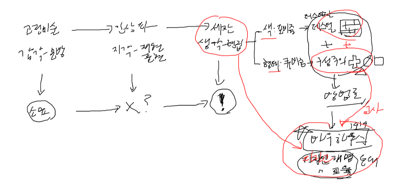 1단계는 예술과 디자인의 요소들을 살펴봅니다. 우리는 20세기 초보다 학문적으로 더 발달했습니다. 더 많은 지식과 지혜를 갖게 되었죠. 새롭게 발견된 지식들을 갖고 그들이 발견한 형태와 색, 언어 요소들의 본질적 특성을 살펴봅니다. 그리고 이를 구성하는 사유방법을 이야기합니다. 데카르트의 사유 방법을 넘어 더 풍부한 사유 방법들이 있음을 알게 될 것입니다.