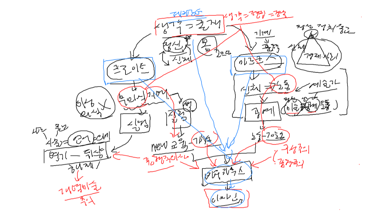 데카르트의 사상에서 더 큰 문제는 신체에 비해 정신이 위대하다는 점이었습니다. 마르크스는 이 점을 공략합니다. 그는 종교와 정치보다 더 중요한 것이 경제와 사회라고 주장합니다. 종교과 정치 같은 상부구조는 경제와 사회라는 하부토대에 따라 달라진다고 주장한 것이죠. 데카르트처럼 정신과 신체 구분은 여전했지만 둘 중 정신이 아니라 신체를 더 중요시 여긴 것이죠.