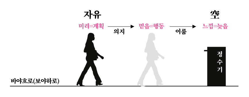 선생님은 칠판에 바야흐로 수평선을 하나 긋고 사람을 그리셨다. 이 사람이 앞으로 나아가서 무언가 행동을 한 뒤에 자신이 한 행동을 느끼면 이미 늦은 것이다. 가령 칼에 손이 베었음을 느끼면 이미 늦었다. 또 자동차 사고가 났음을 느끼면 이미 늦었다. '느낌=늧'의 바탕이 '늦다'와 함께 하는 이유도 이 때문이다. 느끼는 순간 이미 늦은 것이니 사람은 일이 일어난 뒤에는 아무것도 할 수가 없다. 사람이 살아가는 것은 느낌을 위한 것인데, 뒤늦게 느껴 아무 것도 할 수 없는 것이 삶이라면 삶에 무슨 의미가 있단 말인가. 불교는 이를 '공空'이라 말한다. 불교는 '색성향미촉-법' '안이비설신-의'처럼 '느낌에 의한 앎'에 근거를 두기에 뒤늦게 느낀 것들은 모두 허하고 공한 것이다. 그래서 사람의 삶의 덧없다.