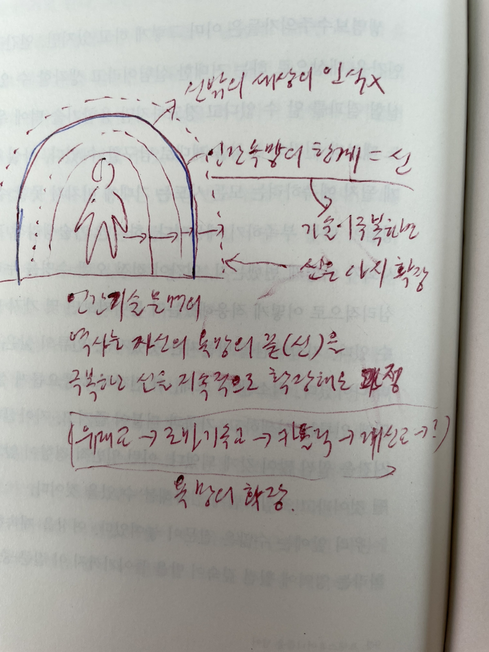 나는 이 문제를 극복하지 못했다. 어느날 한국말 강학회에서 최봉영 선생님이 이런 의미가 담긴 말을 하셨다. “신은 인간 욕망의 극단이다” 나는 이 말을 듣고 크게 깨달았다. ”아... 인간의 역사는 신의 확장, 즉 인간의 보편적 욕망이 확장된 것이구나. 인간의 욕망 확장으로 인간의 문명 기술도 계속 발전한 것이고”
