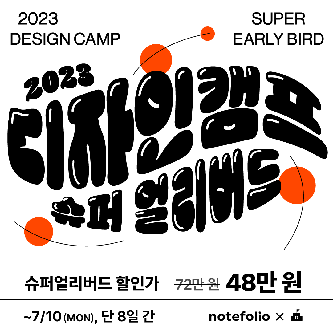 업계에서 활발하게 영향력을 발휘하고 있는 선배 디자이너들과 4박 5일간 멘토 - 멘티로 만나 프로젝트를 완성하는 《2023 디자인캠프》! 단 8일 간 진행되는 슈퍼 얼리버드 할인으로 누구보다 더 빠르고 저렴하게 캠프에 참가 신청을 해 보세요!