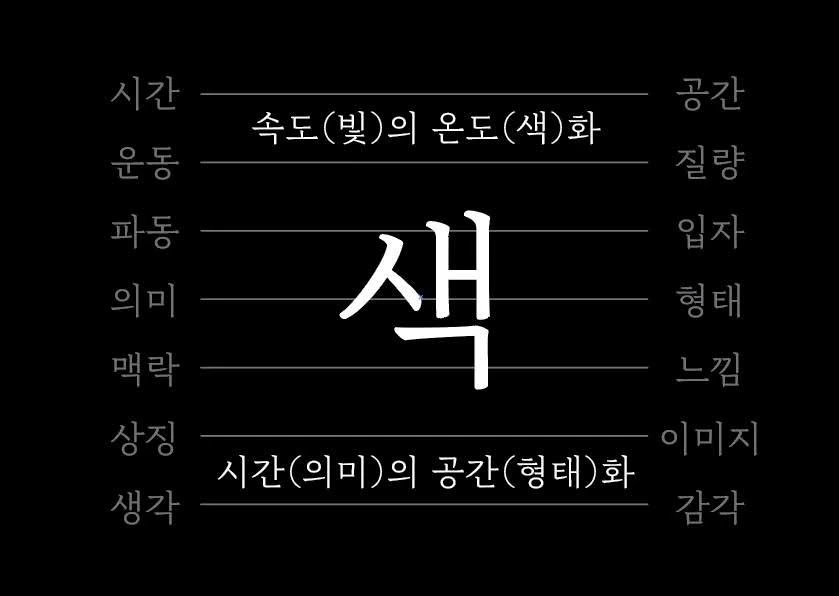 좀더 깊게 가보자. 입자는 운동을 하고, 운동은 속도로 측정된다. 속도는 온도로 환원시킬수 있다. 별의 온도를 보면, 별 속에서 입자들의 속도를 대략 가늠할 수 있다. 빛이 속도라면, 색은 온도다. 속도와 온도가 서로를 환원하듯, 빛과 색은 서로 환원된다. 이렇듯 색은 속도라는 시간을 온도라는 공간으로 전환된 중간적 상태를 말한다.